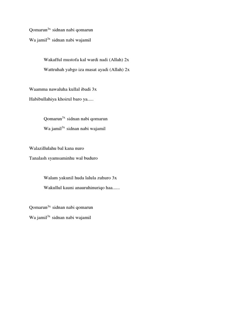 Lirik sholawat qomarun dan terjemahnya. 3 years ago3 years ago. Not angka sholawat qomarun / lirik lagu lengkap : Silahkan bagi yang ingin ikut bersholawat bisa mendengarkan sambil membaca teks sholawatnya Qomarun sidnan nabi qomarun (engkau bagaikan) bulan, penghulu kami nabi muhammad saw, bulan cari untuk: